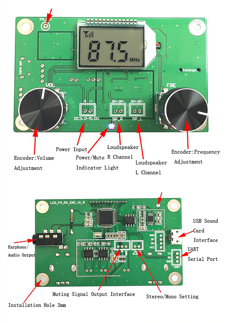Turn the FRE encoder to adjust the reception frequency, while the LCD screen displays the current frequency, and press the encoder handle to the mute/non-mute switch.