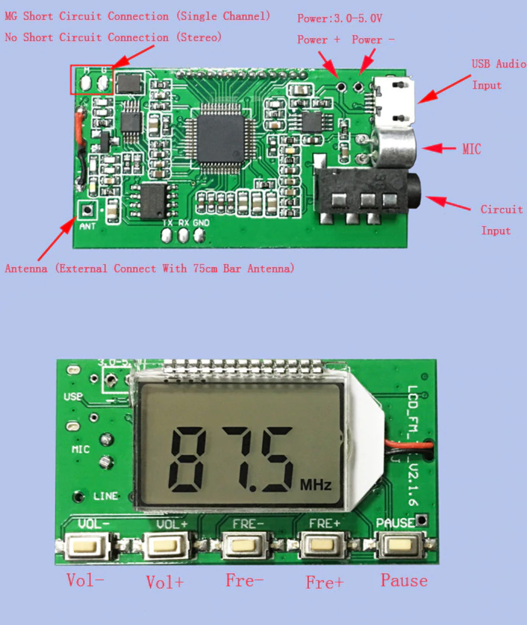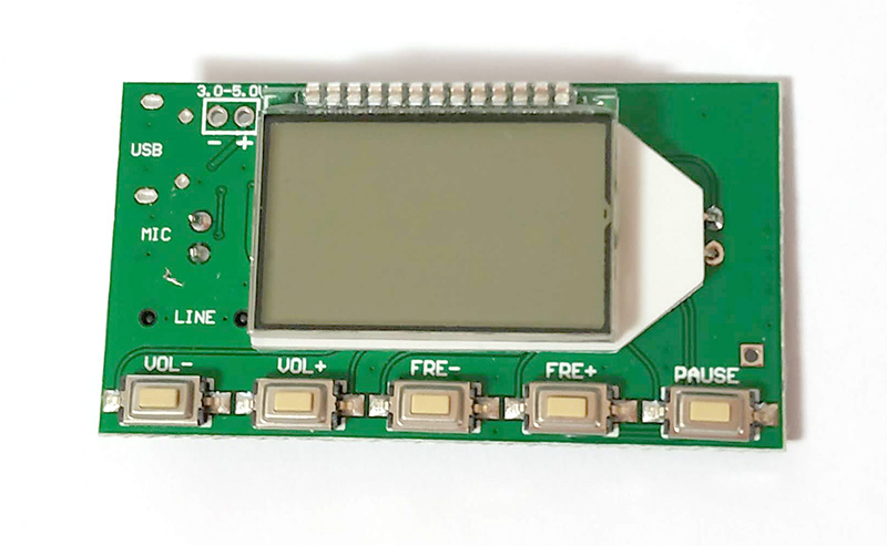 If you need MIC of this module to launch, pull out LINE and USB cable (LINE and USB are not connected). The module is automatically transferred to the MIC channel as the transmitting audio source of FM. This module is equipped with a high sensitivity electret microphone, which can be used in wireless microphone, mother-baby monitoring and so on. Note to adjust the volume of this module to achieve the optimum sound pickup effect when used.