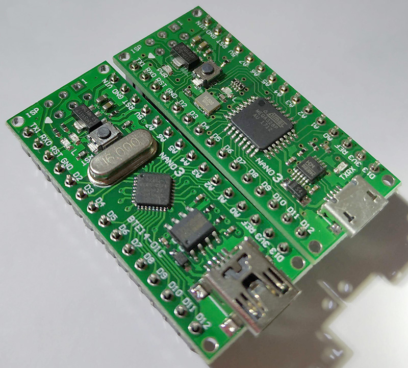 왼쪽 보드는 아두이노 나노인데 메인칩이 ATmega328이 아닌 ATmega168 로 구성되어 있습니다. 2009년에 나온 Arduino Duemilanove에 들어간 칩이라서 칩의 메모리 용량이 작지만 가격도 더 저렴합니다. 간단한 프로그램밍 하는데는 용량 문제가 없으니 상관없긴 합니다.