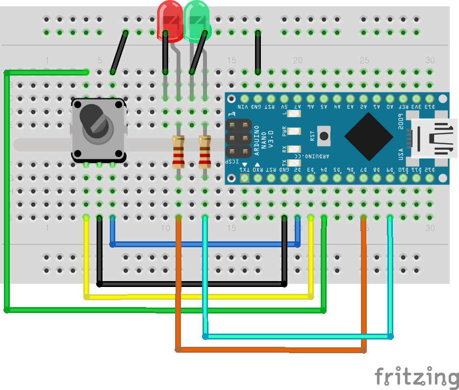 코드는 http://bildr.org/2012/08/rotary-encoder-arduino/ 에서 가져왔지만 약간 수정했습니다. 로터리 돌리면 밝기 조정되고 로터리 누르면 밝기가 리셋되면서 red led가 on/off 됩니다.