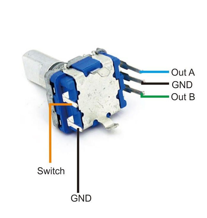 한바퀴 돌아가는데 20 스텝되는 로터리 엔코더입니다. 핀은 왼쪽에 3개 있고 오른쪽에 2개 있습니다.