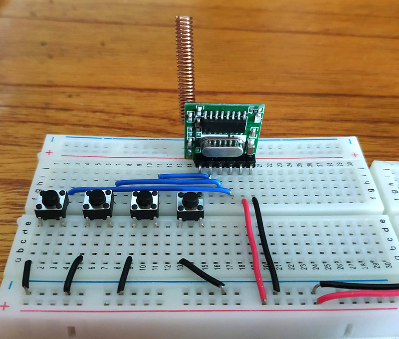 아래의 TX118SA-4 송신기는 제가 추가로 외장 안테나를 설치한 버전입니다. 4개의 채널에 버튼을 연결했습니다.